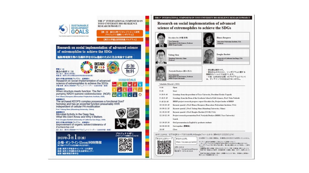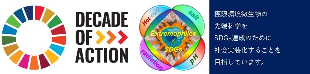 Science and technology have played an important role as one of the measures to enrich our lives. And, in the United Nations, "Science and technology have played an important role as one of the measures to enrich our lives. And, in the United Nations "Transforming our world: the 2030 Agenda for Sustainable Development", breakthroughs through technological innovation are required to achieve the goals outlined in the SDGs. Our research project research Extremophiles can grow in harsh extreme environments such as high temperature, high pH, high salt concentration, radiation, and organic solvents. The extremophiles are attracting attention as new biological resources. We are also researching to achieve the goals (environmental purification, health, and welfare, industrial application) outlined in the SDGs by utilizing the capabilities of extremophiles. The project proclaiming the contribution of SDGs through extremophile research is a new attempt that has never been seen in Japan or overseas and is a feature of this research project. Researchers with expertise in SDGs such as health/welfare, environmental purification, and industrial application, centered on technology, collaborate in cross-disciplinary efforts and find solutions through synergistic effects through interdisciplinary fusion. To contribute to the goals outlined in Japan and organically collaborate with research collaborators belonging to industry, government, and academia in Japan and overseas, and Toyo University has established its position as a core university for extremophile research in Japan and overseas. The aim is to be the Center of Excellence (COE).
