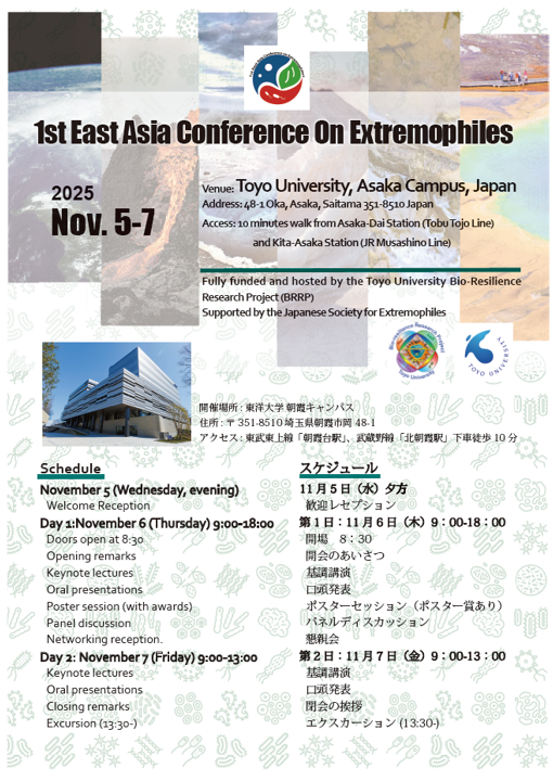 Thank you to everyone who joined the 1st East Asia Conference on Extremophiles (EACE 2025) at Toyo University, Asaka Campus, from November 5 to 7, 2025. Over three days, researchers from across East Asia and beyond shared new results, forged collaborations, and strengthened our regional network.